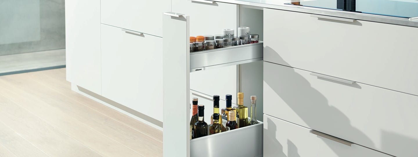 System przechowywania przypraw, puszek, butelek i wąskich przyborów kuchennych.